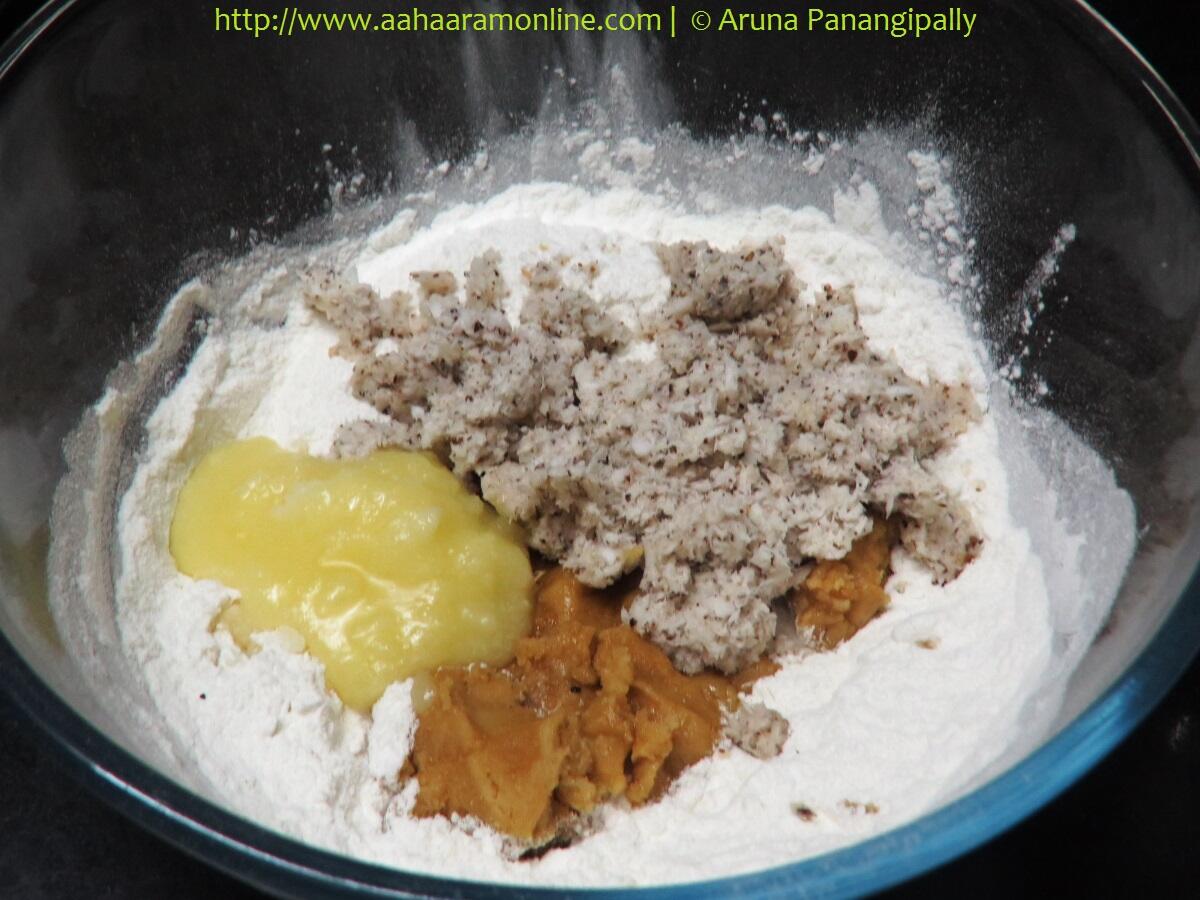- In a large bowl, mix together rice flour, jaggery, coconut, cardamom powder, camphor, and ghee.