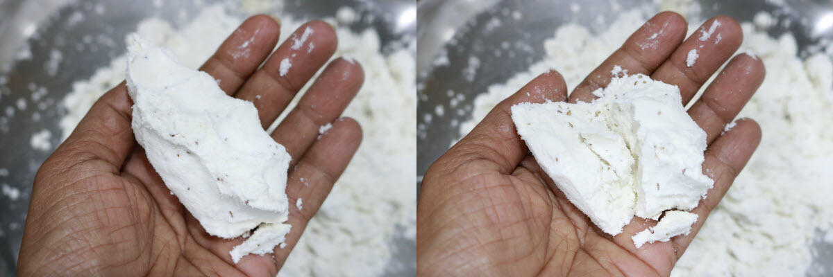- The flour should take the shape of your fist and hold the shape, but when you press it lightly, it should break apart.